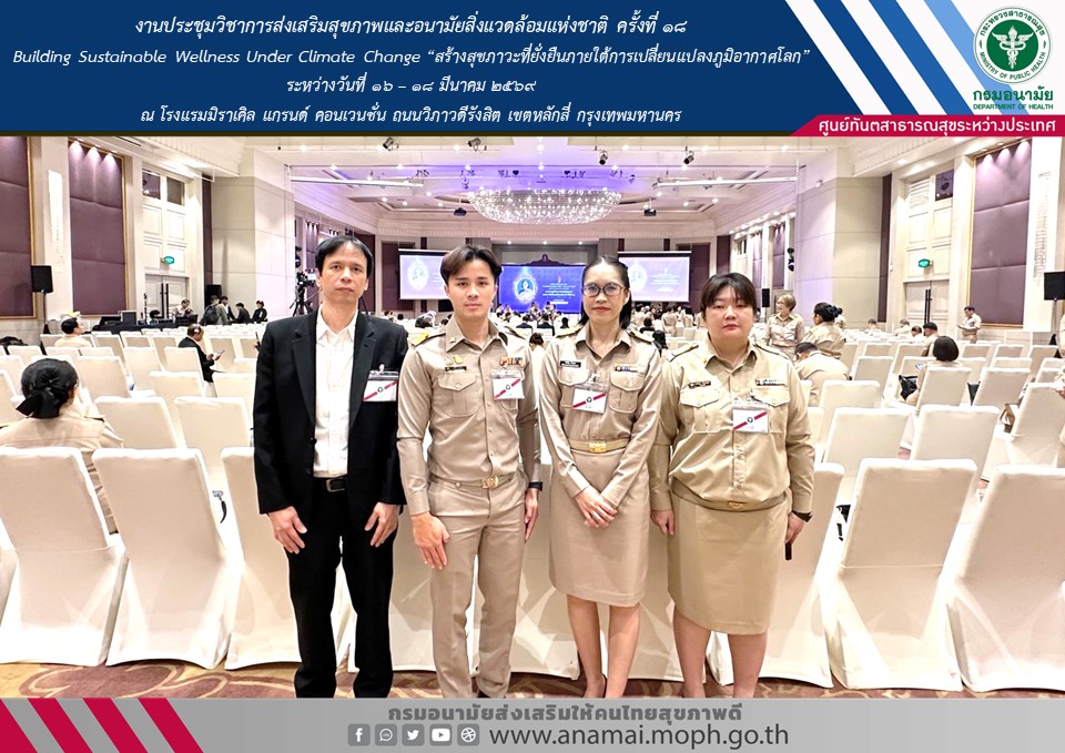 วันที่ 16 มีนาคม 2569 ทันตแพทย์ ดร.แมนสรวง วงศ์อภัย ผู้อำนวยการศูนย์ทันตสาธารณสุขระหว่างประเทศ มอบหมายให้ บุคลากรศูนย์ทันตสาธารณสุขระหว่างประเทศ ได้เเก่ ทันตเเพทย์หญิงนวรัตน์ วินิจจะกูล ทันตเเพทย์ชำนาญการพิเศษ นางสาววิสเพ็ญ กิจธเนศ นักวิชาการสาธารณสุขชำนาญการ นายพรสรรค์ ภู่ทอง นักเทคโลยีสารสนเทศ และนายธานี เเก้วคำ นักวิชาการสาธารณสุข เข้าร่วมรับเสด็จสมเด็จพระกนิษฐาธิราชเจ้า กรมสมเด็จพระเทพรัตนราชสุดา สยามบรมราชกุมารีฯ เสด็จพระราชดำเนินเป็นองค์เป็นประธานการประชุม เเละพระราชทานรางวัล Princess Health Award ในงานประชุมวิชาการส่งเสริมสุขภาพและอนามัยสิ่งแวดล้อมแห่งชาติ ครั้งที่ 18 Building Sustainable Wellness Under Climate Change "สร้างสุขภาวะที่ยั่งยืนภายใต้การเปลี่ยนแปลงภูมิอากาศโลก" ณ ห้องประชุม Miracle Grand A - C ชั้น 4 โรงแรมมิราเคิล แกรนด์ คอนเวนชั่น