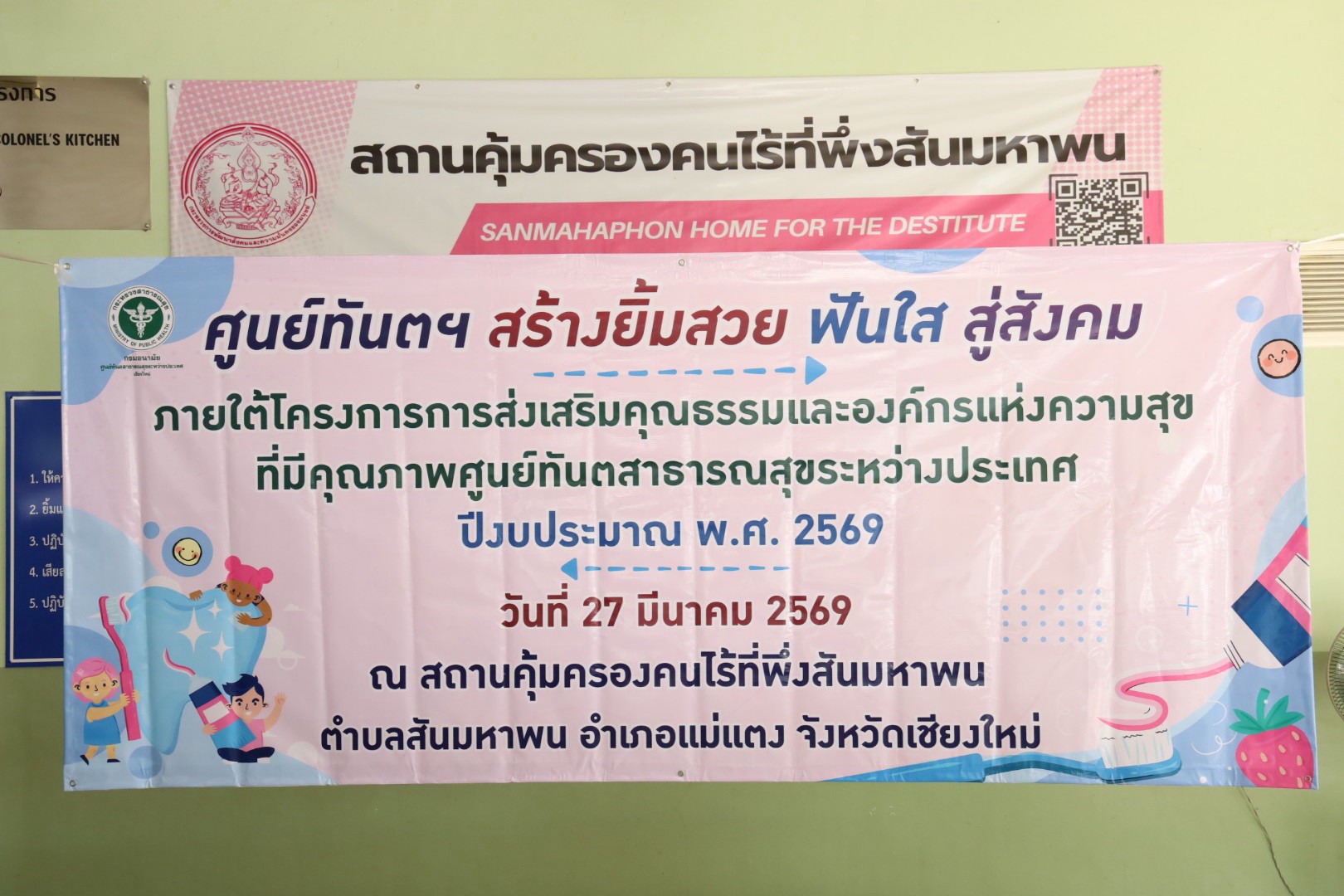วันศุกร์ที่ 27 มีนาคม 2569 ศูนย์ทันตสาธารณสุขระหว่างประเทศนำโดย ทันตแพทย์ ดร.แมนสรวง วงศ์อภัย ผู้อำนวยการ พร้อมด้วยบุคลากร จัดกิจกรรมโครงการศูนย์ทันตฯ สร้างยิ้มสวย ฟันใส สู่สังคม ณ สถานคุ้มครองคนไร้ที่พึ่งสันมหาพน ตำบลสันมหาพน อำเภอแม่แตง จังหวัดเชียงใหม่ (ภายใต้โครงการการส่งเสริมคุณธรรมและองค์กรแห่งความสุขที่มีคุณภาพศูนย์ทันตสาธารณสุขระหว่างประเทศ ปีงบประมาณ พ.ศ. 2569) โดยให้ความสำคัญกับการขับเคลื่อนวัฒนธรรมองค์กรบนรากฐานของความผูกพันและค่านิยม HEALTH เพื่อให้บรรลุเป้าหมายการเป็น “องค์กรคุณธรรมและองค์กรแห่งความสุขที่มีคุณภาพ” หน่วยงานได้บูรณาการหลักคุณธรรม 5 ประการ ได้แก่ พอเพียง วินัย สุจริต จิตอาสา และกตัญญู มาเป็นแนวทางในการพัฒนาบุคลากร ให้เป็นผู้ที่มีทั้งความรู้ ความสามารถ ควบคู่ไปกับการมีจิตสำนึกสาธารณะ โดยสอดคล้องกับแผนปฏิบัติการส่งเสริมคุณธรรม จริยธรรม และการป้องกันการทุจริต กรมอนามัย ประจำปีงบประมาณ พ.ศ. 2569