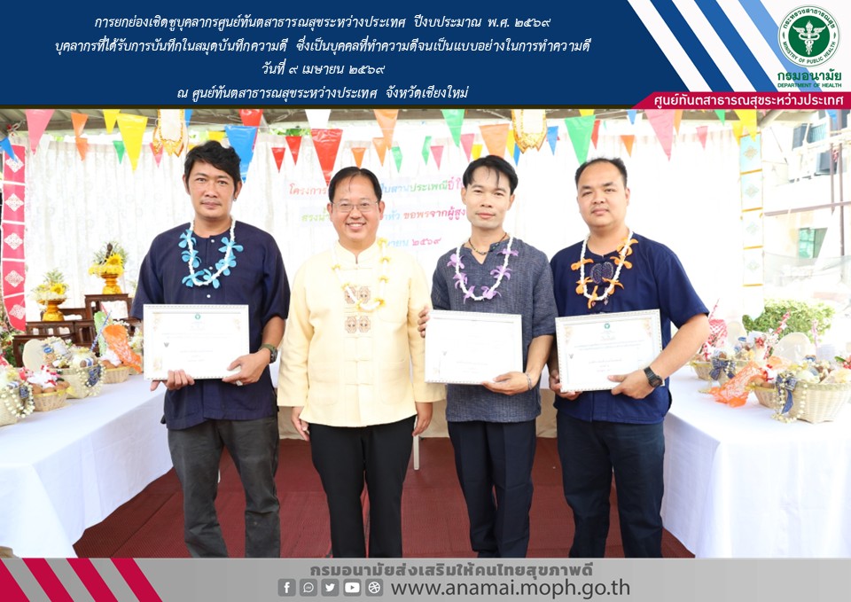 การมีส่วนร่วมในประเพณี "ปี๋ใหม่เมือง" ผ่านกิจกรรมสรงน้ำพระ และพิธีรดน้ำดำหัวขอพรจากผู้สูงอายุ เพื่อสืบสานประเพณีอันดีงามและสร้างความสามัคคี และด้านการเชิดชูเกียรติ จัดพิธีมอบรางวัล "คนดีศรีอนามัย" ประจำปี 2569 และการยกย่องเชิดชูเกียรติบุคลากรที่ทำความดี เพื่อเป็นขวัญกำลังใจในการปฏิบัติงาน